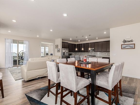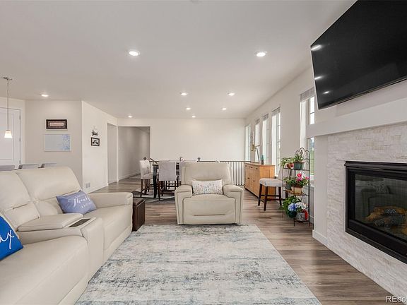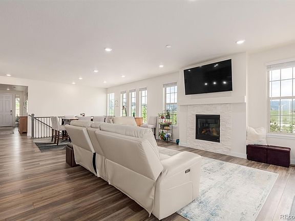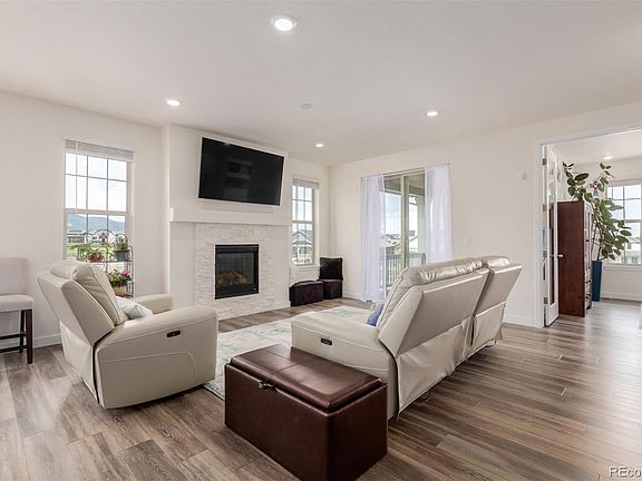 Indulge in ownership of this exquisite ranch-style home boasting 4 bedrooms and 3.5 baths, positioned elegantly at the prestigious end of the street in the coveted Sterling Ranch community. Awe-inspiring curb appeal greets you with a captivating $30k stone facade, low maintenance landscape, a 2-car garage, and an extended driveway. Step onto the inviting front porch, an entryway to a world of refined comfort. Inside, the expansive great room welcomes you with lofty ceilings, recessed lighting, and an abundance of natural light that bathes the space with warmth and openness. Revel in the stunning wood-look flooring and the cozy fireplace, creating an idyllic setting for both gatherings and quiet evenings. The gourmet kitchen is a culinary haven, adorned with striking granite counters, a gas range, and pendant lighting that perfectly accentuates the stainless steel appliances and crown-molded paneled cabinets. A walk-in pantry ensures ample storage, while the center island with a breakfast bar serves as a hub for quick meals. Embrace the versatility of the spacious $80k basement, complete with a mini-kitchen, washer/dryer, walk-in pantry, and a large storage room, providing an ideal space for entertainment or guest accommodations. On the main floor, discover a versatile den, perfectly suited for an office or study. Retreat to the main bedroom, a serene sanctuary featuring plush carpeting and an en-suite bathroom with dual sinks. The walk-in closet offers abundant storage and convenient access to the laundry room. Outside, savor breathtaking mountain views from the deck, a haven for morning coffee or evening relaxation. The backyard showcases a covered patio and ample space for summer barbecues and unforgettable outdoor gatherings. Seize the opportunity to make this remarkable property your dream home.