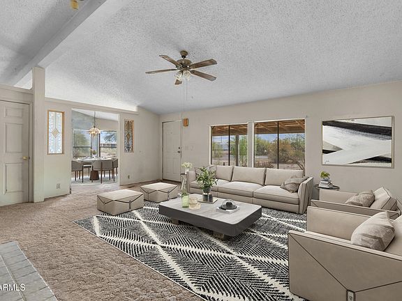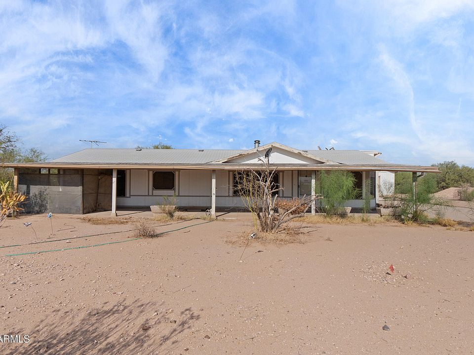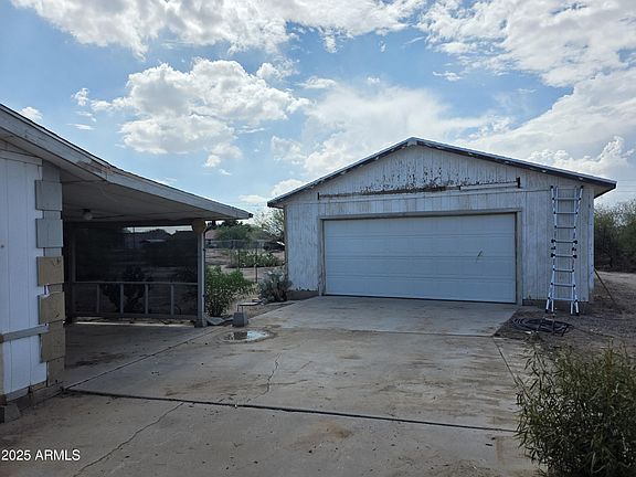 Investor Special! Former model home on 1.03 acres with no HOA, two RV hookups, and a 24x46 detached workshop/4-car garage with power and concrete floors. Spacious 3 bedroom, 2 bath manufactured home offers vaulted ceilings, large living room, formal dining, and kitchen with center island and ample cabinetry. Full-length front porch with mountain views plus additional storage shed. Property allows horses, RVs, and trailers. Located on a cul-de-sac in Arizona City with paved streets, close to I-10 for easy access to Phoenix and Tucson.