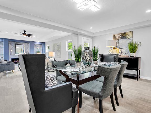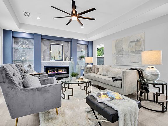 Modern light fixturesOffice spaceElectric fpStainless steel appliancesQuartz countersWine fridgeSleek cabinetry