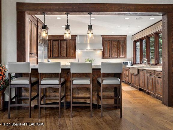 Located at the top of the coveted Granite Ridge subdivision, this custom estate home offers exceptional ski-in/ski-out access at Jackson Hole Mountain Resort, with a groomed ski run passing by the private ski and gear room while maintaining privacy off the main beginner run. Warm gathering spaces throughout are ideal for morning coffee, quick warm-ups, or après-ski entertaining. Main-level living includes a remodeled chef's kitchen with pantry, open-concept dining and living areas, and an expansive primary suite with private office and terrace. Additional features include a three-bay garage with dog wash, an attached one-bedroom guest house, three additional bedrooms, gear room, and media room.