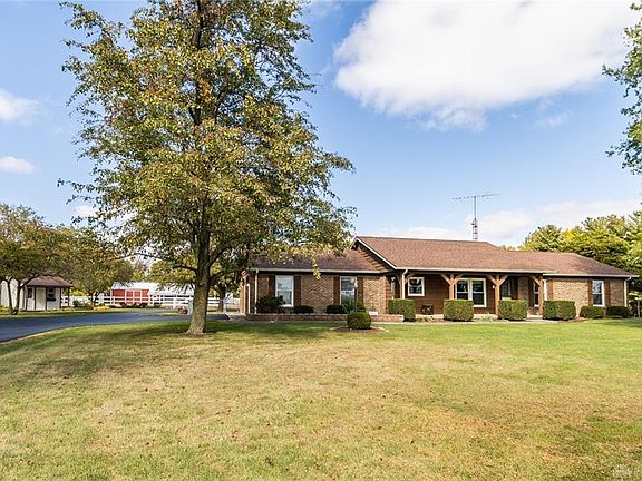 The wait is over - check out this beautiful 5+ ACRE country mini-farm in Franklin Monroe School District w/ a 3 bed/2.5 bath ranch home, 30x56 pole barn w/ storage/stalls, & established/fenced pasture areas that are currently set up for Ruger, the sweet horse that seemed to really enjoy posing for these listing photos! :) You will LOVE the small stream running along the back of the property and the long paved lane that welcomes you home to mature trees and great curb appeal. Offering 1,777 sq ft, the layout features 2 large living areas - a cozy living room w/ a wood-burning stove and a light-filled family room w/ access to the fenced backyard/paver patio area. The kitchen is open to the formal dining space and includes a built-in desk, eat-at bar, two pantries, & plentiful prep space. Convenient laundry/half bath located just inside the garage. Down the hall, find the primary bedroom w/ double closets & en suite bath w/ large vanity & walk-in shower, 2 additional bedrooms, and a full guest bath. Extra linen storage at the end of the hall and a coat closet just inside the foyer. Oversized 2-car attached garage w/ workspace, extra parking/turnaround, beautiful landscaping, and a cute utility shed. The entire barnyard area is fenced. The barn offers electricity, water, concrete floors, lean-tos on both sides, storage rooms, and 2 stalls (one interior w/ access to outside and one exterior/covered). The tillable ground is cash rented. There is also a storage shed in the barnyard. Large ticket items have been updated recently: windows, furnace/central air, roof, leaf fitters for gutters, water heater, paved drive, septic risers installed/pumped, entire barn painted (roof included), and more. Only 13 minutes to Greenville, located near US 36 & St Rt 571. Inviting, well-maintained, and ready for the next owner to love it as much as the sellers have. Call today!