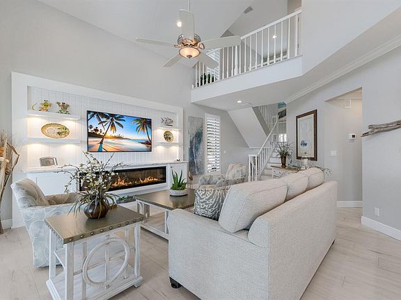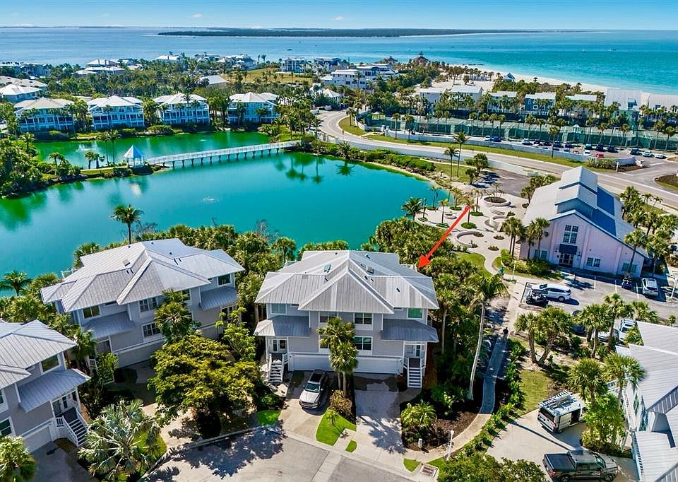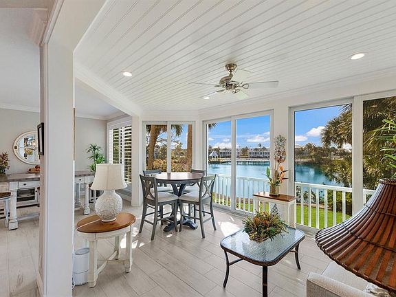 Sleekly updated and beautifully positioned, this 3-bedroom, 3-bath Kentia townhome in Boca Bay’s desirable South Village offers a rare blend of tranquil water scenery, exceptional natural light, and partial Gulf views from its private top-level sundeck. Completely remodeled throughout, the main living level showcases an airy coastal layout with durable, low-maintenance wood-look tile flooring—ideal for a waterfront environment. The reimagined kitchen features high-end Thermador appliances, custom cabinetry, and a sophisticated bar with dual beverage refrigerators, perfect for effortless entertaining. Custom built-ins, an electric fireplace, and integrated LED lighting elevate the living area, while the expanded waterside porch—fully enclosed and under air—provides additional year-round living space. Electric roll-down screens allow you to open the sliders and welcome in the Gulf breeze while preserving crystal-clear lake views unobstructed by traditional screening when not in use, creating a seamless indoor–outdoor experience. Upstairs, the primary suite opens to a private sundeck ideal for enjoying soft Gulf breezes, serene water vistas, and dramatic evening skies. Two additional bedroom suites, each with a fully renovated bath, ensure comfort and privacy for family and guests. A ground-level lakeside patio offers another relaxed outdoor setting, enhanced by the generous and private feel of the end-unit location—an ideal spot for grilling and complete with a convenient outdoor shower area for rinsing off after a day at the beach. Practical upgrades include a 2018 metal roof, impact-rated windows and doors, and an additional laundry hookup in the garage for a second washer/dryer option. A spacious 3+ car garage provides abundant storage for beach gear, bikes, and golf carts. Just a short walk to the Boca Bay Pass Club, the residence offers convenient access to dining, fitness, tennis, and the beach, along with community swimming pools, pickleball courts, short-term boat dockage, a private fishing pier, and the Gulf-front Beach Club. Blending modern upgrades with an exceptional waterfront location, this beautifully transformed Kentia townhome offers a rare opportunity to enjoy the very best of Boca Grande’s coastal lifestyle.