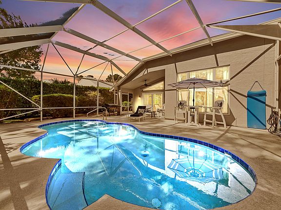 Prepare to be captivated by this stunning, custom-designed single-family pool home, perfectly situated in a desirable Hobe Sound community. The residence exudes charming curb appeal, featuring a modern metal roof, impact windows, a stylish stamped concrete driveway, and lush tropical landscaping that frames the home. The covered front entry features elegant columns and handsome double entry doors with unique dark hardware, setting a sophisticated tone from the moment you arrive. Step inside and be greeted by a truly unique and vibrant interior. The open floor plan is characterized by a blend of polished wood flooring and neutral tile, with walls painted in a cheerful, sunlit yellow that is both warm and inviting. The main living space is dramatically highlighted by high vaulted ceilings and features a stunning, custom-built stone accent wall that houses a sleek fireplace and media center. Adjacent to this area, the formal dining space is defined by an elegant chandelier and flows seamlessly into the gourmet kitchen.