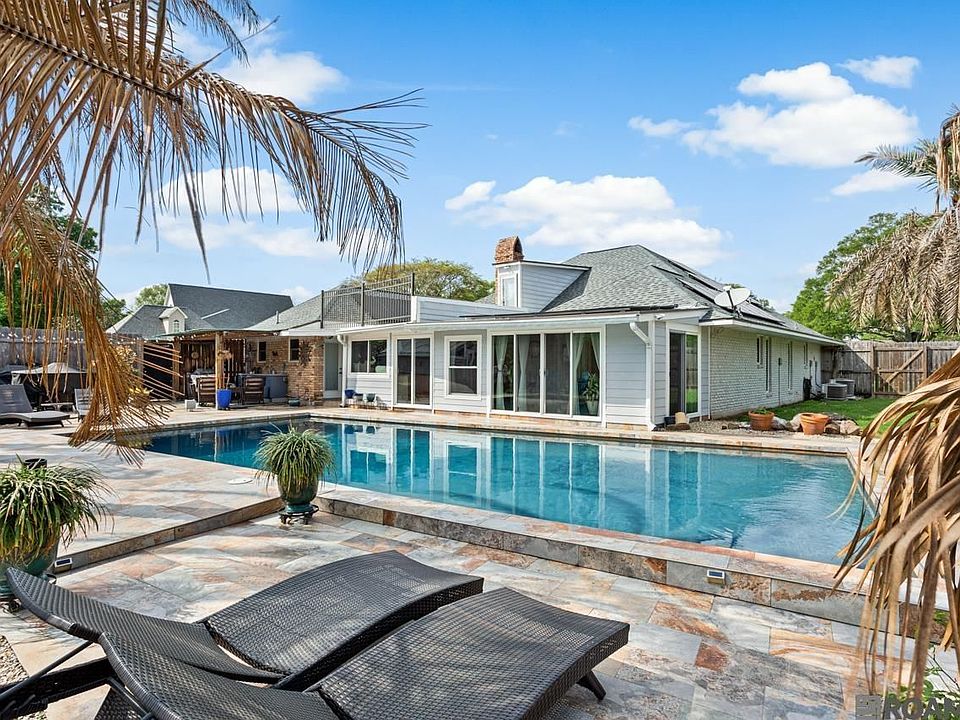 NEW IMPROVED PRICE! Stunning open concept home located in the desirable Plantation Estates subdivision. This home features 3 bedrooms plus a Loft room perfect for your teen or guests with a walk-in closet roof top balcony, 2 full baths and 2 half baths. The home sits on a massive 0.72 acre lot with a welcoming front porch that overlooks the front yard. You are greeted by a spacious open floor plan that features ceramic wood-look tile throughout. The living room offers a cozy fireplace and wet bar with granite countertops and built-in wine cooler. The living area and dining room are separated by a massive center piece island with an abundance of bar seating. This Beautiful Kitchen is equipped with granite countertops, stainless appliances, gas cooktop range oven, and access to the utility room and a half bath. The spacious Master En Suite offers dual vanities, custom multi-head shower with custom subway tile in-lay, and its own office/sitting area with a private entry to the sunroom. The upstairs features a spacious loft that can double as a bedroom with its own walk-in closet and private access to the balcony that is overlooking the luxurious pool. The sunroom features a sitting area, a dining area, sliding bar window, and a bank of windows across that give a breathtaking view of the resort style backyard. A fully fenced backyard with beautiful Palm trees, covered outdoor kitchen patio, 20x40 gunite saltwater pool, pool shed, attached half bath and changing room. This property also features an additional fenced in lot that has a workshop/storage. Also has a sprinkler system for the flower beds around the house. This home, with its spacious interior and resort style backyard, is a perfect place to entertain family and friends. See attached list of all upgrades in documents.