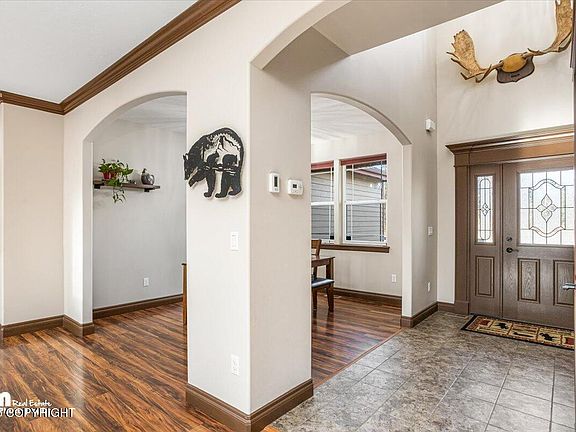 Welcome home, where comfort meets luxury, nestled into 2, mostly treed, acres. Whether you're warming up by the inviting fireplace on a chilly winter evening or basking in the sun on the expansive back deck with custom built-in seating, this property is designed for year-round enjoyment.As you step inside, you're greeted by an impressive two-story entryway bathed in natural light.The grandeur of the entry is just the beginning. The main living area exudes an open, airy ambiance with soaring 9-foot ceilings, providing the perfect backdrop for both relaxation and entertaining. Every corner of this home blends style and function, offering a tranquil escape from the everyday hustle, while still keeping you close to nature's beauty. The kitchen features a walk-in pantry and a large island with seating for four, perfect for gatherings or everyday meals. The primary suite boasts a tray ceiling, walk-in closet, and spa-like bath with dual vanity and jetted tub. Each bedroom features a ceiling fan, and the second full bath also offers a dual vanity for added convenience. The list goes on! Storage is plentiful with a dedicated laundry room and an oversized 3-car garage.The paved approach provides RV parking, and the established chicken coop is ready for your flock. Looking for more space? The adjacent 2-acre lot is also available for purchase with airstrip access! Located just a short drive from Palmer and Wasilla, this property offers comfort, functionality, and room to grow. Note: The playhouse visible in photos is located on the neighboring lot, also for sale.
