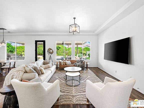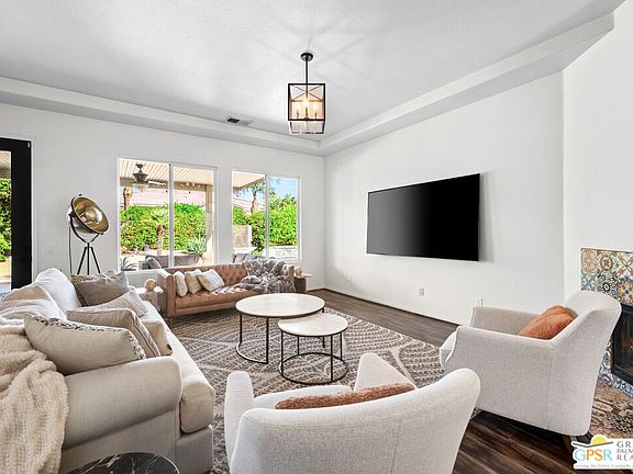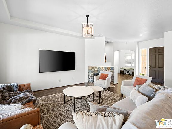 Nestled within the sought-after Esplanade gated community, this stunning home perfectly blends modern style with inviting warmth. Step into the chic and spacious living room, where a beautifully tiled fireplace sets the tone for cozy evenings and effortless elegance. The open layout flows seamlessly into the dining area, ideal for hosting unforgettable dinner parties, and continues into the fully updated kitchen, featuring luxurious quartz countertops, a statement island with a waterfall edge, and beautiful finishes. Start your mornings in the chic breakfast nook, the perfect spot for coffee and conversation. With three bedrooms plus a versatile den, this home offers endless possibilities, from a private office to a creative studio or guest space. Step outside to your own private paradise. The expansive covered patio invites year-round outdoor living, complete with a built-in BBQ and fire pit for cool desert nights. On warmer days, unwind beside the sparkling pool and spa, surrounded by lush landscaping and tranquil vibes. Located just minutes from the I-10 freeway, dining, and shopping, this home offers both convenience and serenity, the best of Desert living.