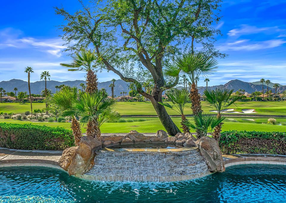 Situated on a premier lot near two fairways, also with lake and mountain vistas, this Encanto One residence captures the scenery and relaxed sophistication of Rancho La Quinta Country Club. High ceilings, abundant natural light, and quality construction define the open layout connecting the living room and fireplace to a generous kitchen finished with granite surfaces, island seating, and stainless-steel appliances. Designed for effortless entertaining, the backyard offers a pool with two waterfalls, raised spa, built-in barbecue station, and multiple seating areas covered and uncovered, surrounded by new desert landscaping and turf. Three bedrooms plus a den provide needed privacy; each bedroom is ensuite, including a spacious primary suite with a large walk-in closet and well-appointed bath. Additional features include a two-car garage with separate golf-cart bay and refined architectural detailing throughout. Homeownership includes guard-gated security and Athletic and Social memberships granting access to the Racquet Club's tennis, pickleball, bocce, fitness, and dining facilities, along with two eighteen-hole golf courses designed by Robert Trent Jones and Jerry Pate, respectively. The home sits off the 4th hole of the Pate course, and the 7th hole is across the lake. Furnishings are negotiable.