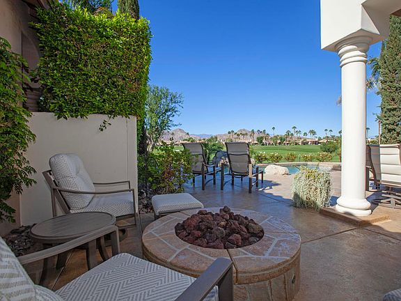 Experience refined desert living in this beautifully upgraded residence located within the prestigious Rancho La Quinta Country Club. Offering magnificent south and west views of the Santa Rosa Mountains and foothills, as well as multiple fairway vistas of the Jerry Pate Championship Golf Course, this home captures the essence of resort-style sophistication. From brilliant sunsets to tranquil mornings overlooking lush greens, every detail of this home has been enhanced for beauty and comfort. The exterior exudes elegance with beautiful exterior paint, new upgraded wood-look garage doors, and a custom wood-and-glass entry door. Three en-suite bedrooms plus a bonus room that is perfect as an additional sleeping space. A large multi-car driveway welcomes guests, while freshly painted trellises and a tiled and sealed primary patio provide perfect spaces to relax outdoors. Exquisite patio and bedroom furnishings elevate the home's inviting desert lifestyle. Inside, the home has been thoughtfully transformed with artistic craftsmanship. Custom finishes on all brick, stone, hearth, mantle, and cabinetry create a warm, cohesive aesthetic. Venetian plaster in the powder room and detailed door and frame finishes showcase fine attention to design. The interior has been painted and complemented by new window treatments and solar film in the kitchen nook and great room to maximize comfort and privacy. The remodeled kitchen features new quartz countertops, a convenient trash pull-out, and custom-finished cabinetry that reflects timeless elegance. Tile floors have been professionally cleaned, sealed, and polished, while new carpeting in the guest bedroom and bonus room adds softness underfoot. Beam ceilings, base moldings, and custom lighting enhance the great room's architectural appeal, along with a built-in entertainment center and electronically controlled window shades. Offered furnished per Inventory List, the home includes premium furnishings throughout: beautiful bedding and drapery in the primary suite guest bedroom suites with king and queen furnishings, area rugs, accessories, and a custom framed mirror in the primary bath. Every room radiates modern desert elegance with a warm, inviting feel. With its meticulous craftsmanship, high-end finishes, and spectacular mountain and fairway views, this Rancho La Quinta C.C. retreat represents the finest in desert country club living. Please see the two-page improvements list.