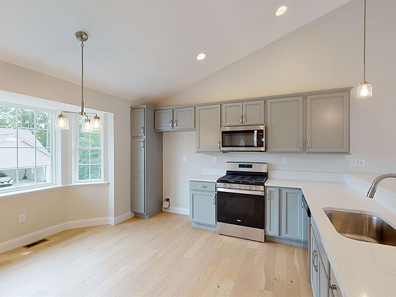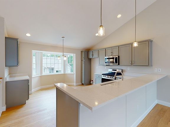 Welcome to Pleasant View Farm, a new community with 166 two-bedroom, two-bath, two-car garage condominiums on over 200 sprawling acres. The split-level style floor plan is designed with a spacious open concept living/dining/kitchen area, making it ideal for entertaining. This unit has been thoughtfully curated by our team and will be move-in ready by April/May of 2025. Kitchen features stainless-steel Whirlpool appliances including counter-depth French door refrigerator, quartz countertops, Kemper soft-close cabinets in 'White', pantry cabinet with pull out drawers, Corona lighting package, and vaulted ceilings. Engineered hardwood floors throughout main area, gas fireplace with double sliders leading to your maintenance-free 22x12 deck, and first floor laundry are all part of this sought-after floor plan. The primary suite has two closets, and the primary bath features a walk in shower, oversized linen closet, white dual vanity and ceramic tile floors. Finished lower level for an additional 797 sq. ft. of living space. Community amenities include a community center with fire pit, community garden, walking trails leading to the Rockingham Recreational Trail, and an RV/boat storage lot. Pleasant View Farm is easily accessible to all major highways, schools, shopping, and area attractions. Travel to the lakes, mountains, beach, or Boston in under 90 minutes. Pictures are of similar unit.