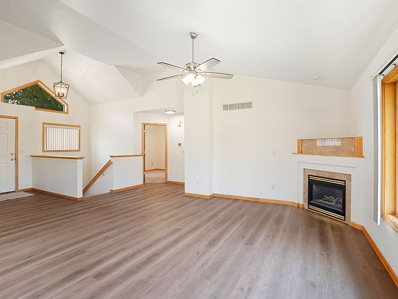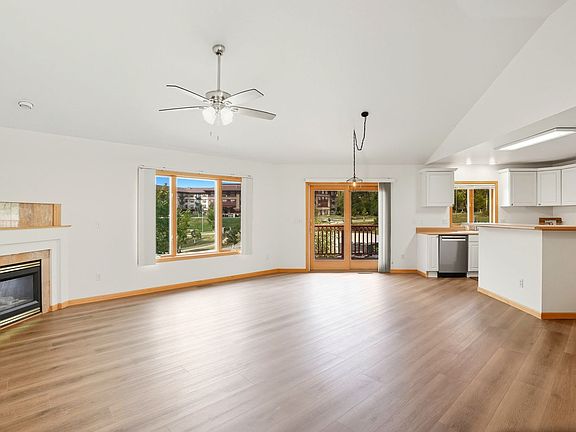 This spacious and bright Woodridge Estates townhome offers 2064 finished square feet, a desirable end-unit location, and a flexible layout with two bedrooms upstairs and two downstairs. The main level features vaulted ceilings, an open living area with gas fireplace, a large balcony overlooking the backyard, and a modern kitchen and breakfast bar seating. A stack washer and dryer are conveniently tucked into a main-level closet just off the kitchen. The finished walk-out lower level includes a second living area, patio, additional bedrooms, a full bathroom, and a large storage room.