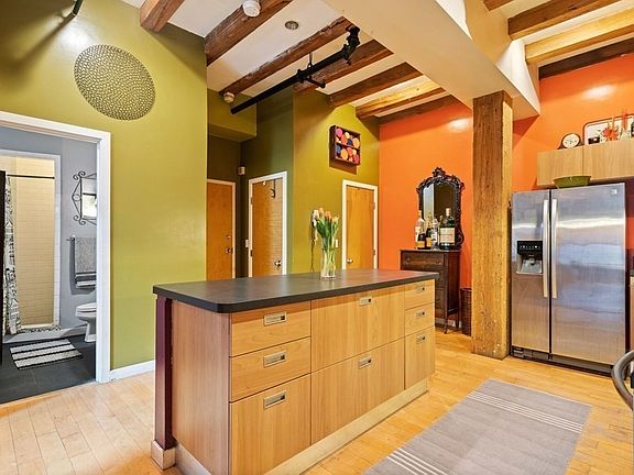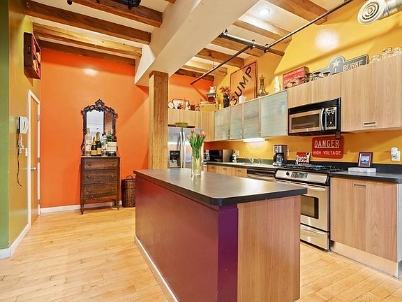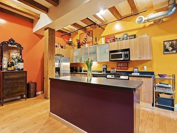 - Features: Beamed Ceilings, Closet/Cabinets - Custom Built, Flooring - Wood, Kitchen Island, Stainless Steel Appliances, Gas Stove