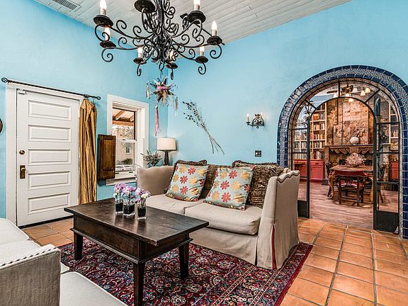 This elegant and richly authentic walled compound offers the very best of old and new...perfect as a full time residence, second home or vacation property with income potential near to Santa Fe in the vibrant village of Cerrillos. Features and amenities include Parisian- style sitting room and great room with soaring ceiling, library- style shelving, dining area and fireplace, newly designed kitchen with quartz waterfall counters, sleek master bedroom and master bath, 2 other charming bedrooms in main house, attached guest house with kitchen, bath and exterior entrance, greenhouse, screened in porch with tile roof, historic potting shed with tile roof, 1 bay garage, plentiful off-street parking, workshop, full height cellar and exceptional newer studio space that opens to the street (zoned commercial and residential) perfect for retail or gallery. Rounding out the setting is the beautifully shaded courtyard replete with perennials gardens and native plantings. Supremely adaptable, serene and historic beauty.