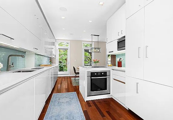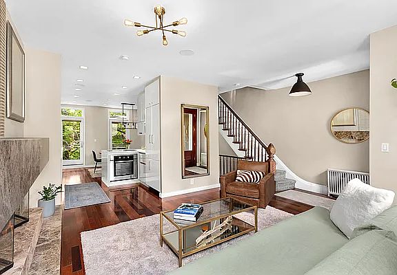 The result of a custom tailored, total renovation - this 20ft wide, move in ready single family home, with four bedrooms, three and a half baths, four stories plus full cellar level, and three very tranquil private outdoor spaces with the ability to add an additional lot for a tremendous back yard, is located in one of Brooklyn's most desirable neighborhoods, Carroll Gardens- on a quiet, tree lined, legendary "Place" block, famous for their iconic front gardens. A classic double door vestibule welcomes you inside to discover the open parlor level enriched by thick hardwood floors, a grand, wood curved staircase, and extra tall ceilings dotted with designer lighting. Unwind in the bright front living room with an inviting marble fireplace and charming view of the gardened front yard through classically tall windows. Enjoy entertaining family and friends in the super sunny dining area where three floor to ceiling glass patio doors transports you to a large, unusually private deck offering seriously lush treetop views from this peaceful retreat. In between, the brilliantly lit, ideally located kitchen impresses with copious gleaming white lacquer cabinetry, tranquil sage glass tile backsplashes, and chefs delight upscale Bosch appliances. For added convenience, a fully tiled half bath and deep coat closet rounds out this level. Follow the graceful, curved staircase to the second floor where two massive bedrooms, each with built in offices and custom closets are joined by a double entrance oversized full bathroom with floor to ceiling subway tile, double vanity and a super cool, easy to care for epoxy floor. One level up, the primary suite begins with a tremendous skylight that can easily be opened for the spring and fall breeze- and bathes this level with an astonishing amount of natural light. This full floor retreat consists of four individual spaces, beginning with a king sized bedroom with classically tall windows offering open-sky and tree top views. Onto the en-suite oasis bathroom- a study in luxury itself. Here a second large skylight illuminates the sophisticated marble double vanity, two person jacuzzi tub, and separate frameless glass steam and rain shower. Moving on into the enviable custom walk in closet-the size of a bedroom, and ready to accommodate the most accomplished wardrobes. Separate from the living space, a full laundry room with double-capacity LG washer and dryer, storage cabinets and a large utility sink completes this level. Downstairs, the garden level can be accessed through the home's interior staircase, or its ideal secondary front entrance with bench seating and large coat closet perfect for storing winter and sports gear. This lower level begins with the roomy fourth bedroom with two closets and third full bathroom, both serving well for visiting guests. Continue on to find the spacious recreation/media/art room which seems to go on forever before rounding into the cozy home office, and entrance to the second outdoor patio, accessible only from this level. A full cellar level below houses the mechanicals-including the central AC, and provides for more storage than you may ever need. This charming and quiet Carroll Gardens location offers easy parking and simple access to local playgrounds, parks and the neighborhood's best schools and restaurants including Buttermilk Channel, Frankies 457, and Lucali's . 8 4th Place is a warm and wonderful heaven in a storybook Brooklyn location.