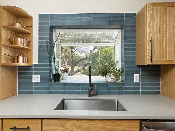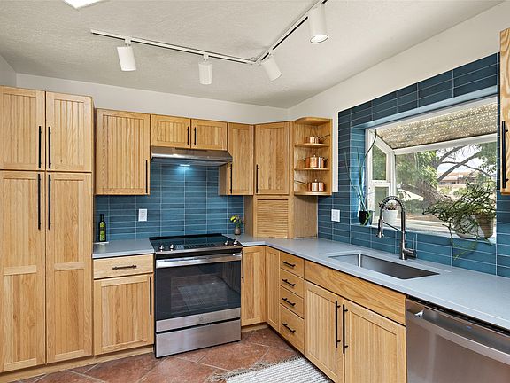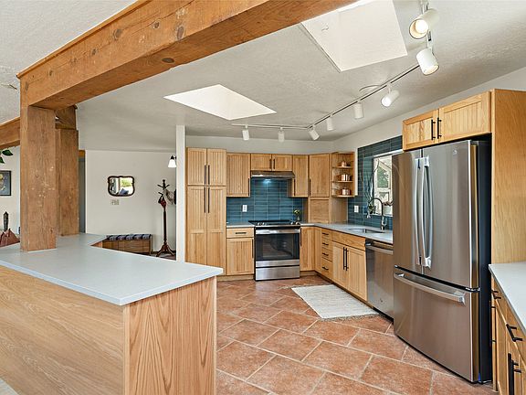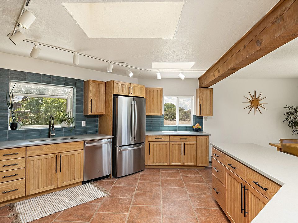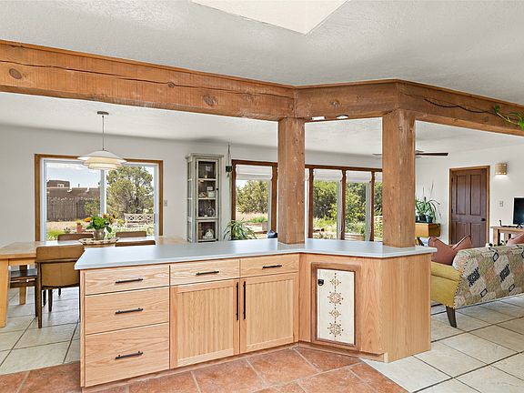 Beautiful new kitchen and baths in this sweet passive solar Eldorado home. A spacious island with storage was added along with a stainless steel French door refrigerator, new dishwasher, oven, backsplash and hardware. Undermount sink and quartz countertops. Kitchen opens to dining and living rooms. Bath renovations included, new tubs, tile, sinks and quartz counters. Primary bedroom has door to outside patio. Good bedroom separation, no steps, no Kitec. Galisteo Basin views. All new ceiling fans. Proper laundry room with hanging rod. Washer and dryer stay with the property. New hardscaping in front and backyards. Pear, apple and apricot trees and even grapevines! Super clean and ready to go. SELLER WILL REQUIRE LEASEBACK FOR 14 DAYS AFTER CLOSING.