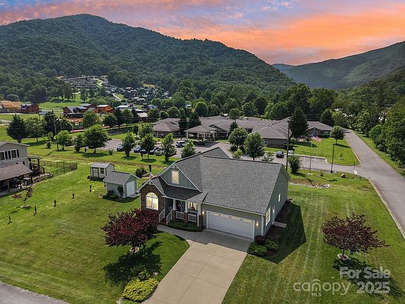 Immaculate 3BR/2BA one-level home on a level corner lot in beautiful Maggie Valley with breathtaking mountain views! Built in 2018, this one-owner home features 9-foot ceilings, crown molding, wood floors, carpeted bedrooms, & tile bathrooms. The open kitchen offers granite countertops, ample cabinets, a pantry, and stainless appliances including a Bosch dishwasher and multi-drawer fridge. The spacious primary suite boasts a large walk-in closet, double vanity, and walk-in shower. Enjoy natural light and views from the sunroom, which offers 180 sq ft of additional living space that is not included in the heated square footage. The third bedroom has a convenient sink and was originally designed as a craft room, but would make a great office or keep as a bedroom. The oversized garage offers an additional 2 feet of space. Additional features include a concrete drive, architectural shingle roof, & window coverings that are included. No HOA, city water/sewer, & Spectrum internet available!
