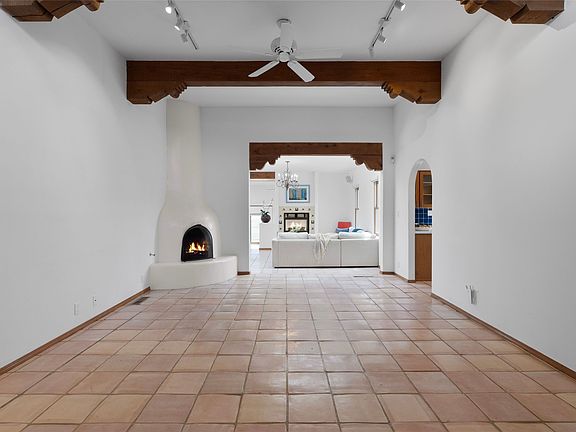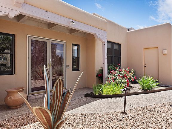 Beautiful landscaping welcomes you to this residence in a quiet setting on a cul-de-sac with picturesque mountain views. The home features multiple living spaces and a studio. Its floor plan includes a living room with a kiva fireplace, a dining room, and a den plus another seating area on either side of a gas fireplace. The den and seating area each have access to a flagstone patio with vistas of the Jemez mountains within a walled landscaped back yard with beautiful roses. The primary bedroom has a gas fireplace and access to the flagstone patio as well. The studio space has also served as an exercise room and offers three large storage closets. The oversize laundry room has lots of additional storage with a bank of cabinetry and two closets. A new roof with a 12-year warranty was installed in 2021, and a new furnace and evaporative air conditioner were installed in 2024. Easy happy living in Eldorado!