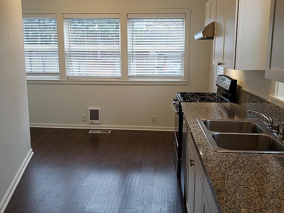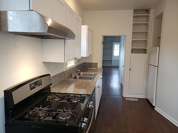 Galley-style kitchen with lots of light and dining area. Front and back porches. 1 designated off-street parking space behind building. Central gas heat and A/C.