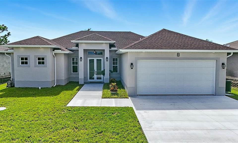 Welcome to your brand-new 3-bedroom, 2-bath home located in the desirable Rotonda Sands subdivision. This beautifully designed residence features a covered double-door entry leading into an open floor plan with tile flooring throughout, tray ceilings, and an abundance of natural light. The eat-in kitchen shines with a center island adorned with a tile accent, stainless steel appliances, backsplash, modern light fixtures, and luxurious gold finishes including a gold sink and cabinet handles. The kitchen opens up to a spacious dining area, equipped with large window. This open concept living area leads directly out to a covered, screened-in lanai—perfect for indoor-outdoor living. The primary suite offers a tranquil retreat with a spa-like bathroom that includes a large standing shower with modern tile and wood paneling, double vanity with gold fixtures, and a custom walk-in closet with built-ins. Additional features include a separate laundry room, hurricane-impact windows, and a lush backyard space. Rotonda Sands is a peaceful, deed-restricted community with scenic walking areas, lakes, canals, and greenbelts, located near Boca Grande and Englewood beaches, top-rated golf courses, and the Cape Haze Pioneer Trail. With low HOA fees and a serene, well-maintained setting, this home combines modern elegance with Florida’s laid-back lifestyle. You don’t want to miss this one!