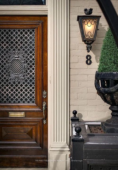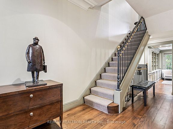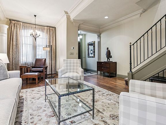 Nestled in the prestigious Yorkville neighbourhood, this exquisite renovated 1880s heritage townhouse masterfully blends the charm of an English country cottage with modern luxury. Showcasing the highest standards of craftsmanship, this three-level residence offers over 2,000 square feet of refined living space, where warmth, character, and European-inspired sophistication abound. The thoughtfully designed interior features antique elm flooring, limestone gas fireplaces, custom millwork and soaring ceilings that flood the home with natural light. Every detail reflects a commitment to timeless quality and elegance. The main floor welcomes you with a gracious foyer leading to a formal living room highlighted by a bay window and limestone fireplace. A bespoke library, complete with intricate millwork and built-ins, opens through French doors onto a balcony overlooking the serene greenery of Ramsden Park. A stylish powder room with imported Parisian wainscoting adds to the charm of the home. The home features a country-style eat-in kitchen, equipped with an iconic AGA stove, walk-in pantry, Belgian blue stone countertops, custom cabinetry, elm ceiling beams, and heated French limestone floors. The adjacent dining and family rooms (or optional guest bedroom) flows into a landscaped, French-inspired garden. The serene primary bedroom features custom built-ins, a walk-in closet. There is a spa-like five-piece bathroom with Carrara marble and limestone. The second bedroom features wood-panelled cathedral ceilings, skylight, and Juliette balcony overlooking treetops, offering a tranquil hideaway. Designed with flexibility in mind, the home accommodates 2 to 4 bedrooms and includes the rare convenience of two-car parking via the laneway. Ideally located just steps from Yorkville's renowned boutiques, fine dining, top-rated schools, parks and has easy access to Rosedale Subway.