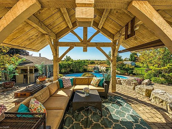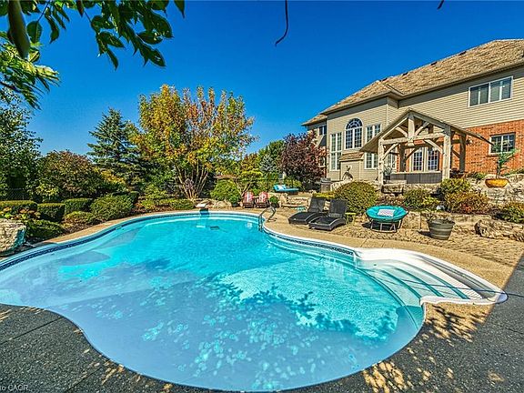 Exquisitely presented, Custom Built 5 bedroom, 5 bathroom Caledonia Showhome on sought after Blackburn Court situated on Irreplaceable pie shaped lot. Incredible curb appeal with brick & complimenting sided exterior, oversized paved driveway leading to welcoming front porch & entertainers dream backyard Oasis with professionally landscaped yard highlighted by salt water inground pool with masterfully planned amour stone accents, gazebo area, rod iron fencing, & multiple sitting areas. The gorgeous interior showcasing approximately 4500 sq ft of opulent living space highlighted by custom eat in kitchen cabinetry, bright family room with open to above ceilings & gas fireplace, formal dining area, convenient office area, 2 pc bathroom, & MF living room / den. The upper level features 4 spacious bedrooms including primary bedroom with 5 pc ensuite & walk in closet, secondary bedroom with ensuite and walk in closet & 2 bedrooms with jack & jill bathrooms. The finished basement is ideal for large families with rec room, 5th bedroom, 3 pc bathroom, gym area, & ample storage. Upgrades includes flooring, fixtures, decor, lighting, roof shingles, - 2018, landscaping, irrigation system, & more. Conveniently located minutes to amenities, parks, schools, shopping, & Grand River. Rarely do properties of this caliber come available with this lot, location, & stunning finishes throughout. Caledonia Luxury Living at its Finest.