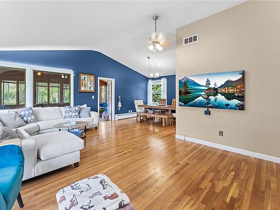Welcome to 8 Blue Gentian Rd, nestled in the highly sought-after Western Cranston neighborhood. This expansive custom home offers a remarkable living experience with a fully-equipped in-law suite. Boasting 5 bedrooms and 3 full baths, the property features a generous family room highlighted by a brick fireplace, cathedral ceilings, and a stunning wall of windows. The main level includes a formal dining room and a 16x24 four-season sunroom, perfect for year-round enjoyment. The primary bedroom is complemented by a newly remodeled bath, while the open kitchen and sunny breakfast room enhance everyday living.The fully-appointed in-law suite is an exceptional highlight, featuring 2 bedrooms, a full bath, and an open floor plan with beautiful skylights and a walkout to the serene backyard patio This area overlooks beautifully landscaped, private grounds. Additional amenities include hardwood floors, central A/C, sprinklers, and a two car garage that can be converted to fit 4 cars. Situated on a corner lot, the property is conveniently located nearby amenities with easy access to highways and shopping. This home seamlessly blends comfort, style, and convenience, making it an ideal choice for those seeking multi-generational living.