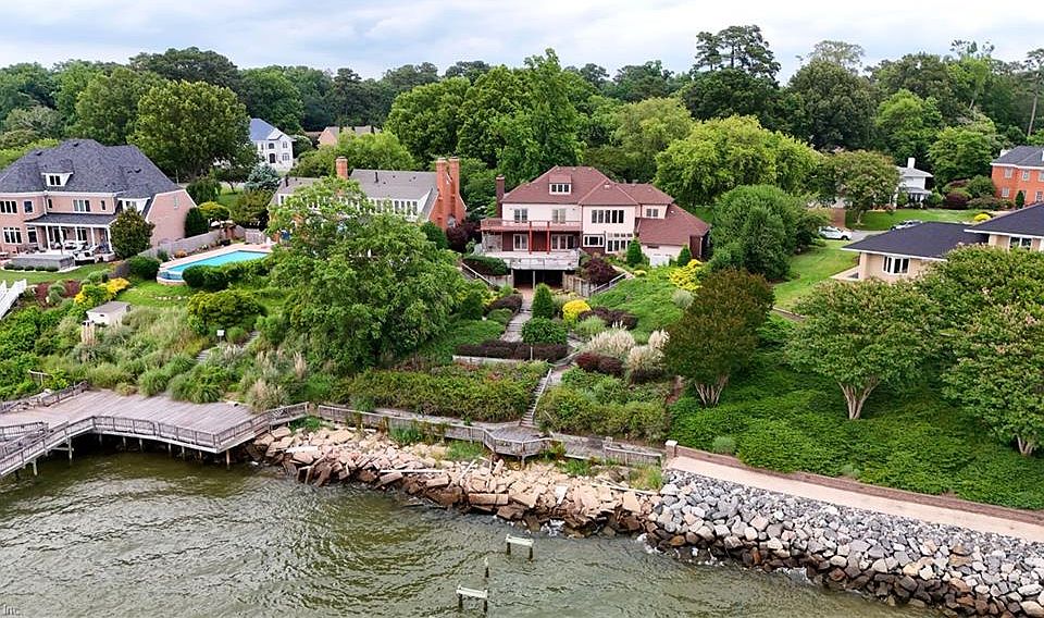 This customed built James River waterfront home features the best sunsets possible in a convenient location in midtown. The full basement is a walk-out with wood burning fireplace, mechanical, recreational, storage and wine cellar rooms. Primary suite offers his & her bathrooms, large walk-in closet with a balcony over looking the river. A crow's nest entry from the second floor spiral steps is perfect for telescopic views of the abundance of fowl & dolphin activity. FIRST FLOOR OFFICE & BAR. "SOLD AS IS"