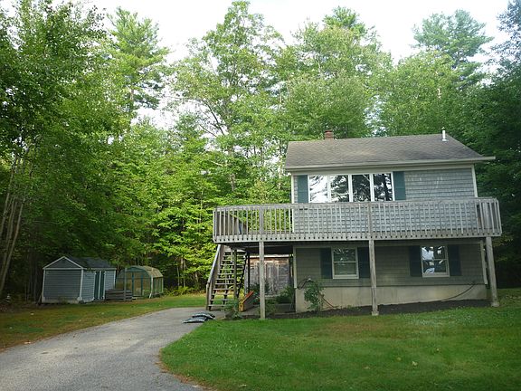 Affectionally known as ''The Treehouse'', this 2-story home has an amazing view of Bonny Eagle Pond from the 2nd floor & the huge wrap around deck. The 10 ft. ROW is just across the street and leads to a small dock and a small sandy beach. Swim, canoe, kayak, ice fish and enjoy your little piece of heaven. Makes a great year-round home or seasonal retreat. Features a 3-year-young Baxi boiler and central air conditioning so you will be super comfortable whatever the season. Freshly painted throughout and ready to move in. There are 2 large outbuildings and a green house. Easy to show.