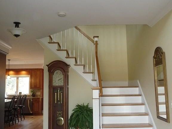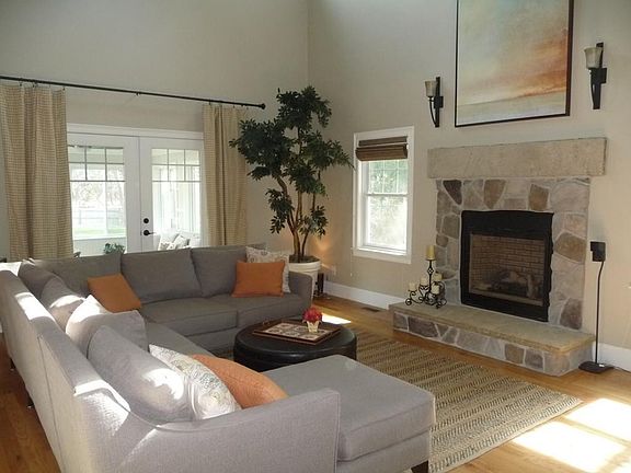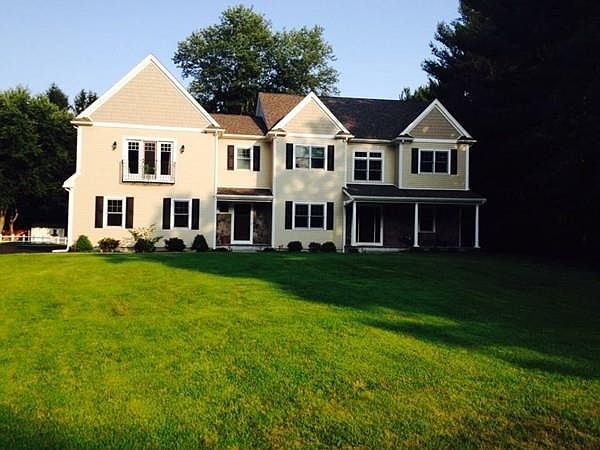 Beautiful custom built colonial on one acre in a walk to town location! Three years young it is a perfect family home. Kitchen has large center island, custom cabinetry, granite countertops, stainless appliances. Opens to WOW family room with soaring 18 foot ceiling and stone gas fireplace. Three season porch with sliding windows and blue stone patio overlook a private back yard. First floor has 9 foot ceilings, formal living room and French doors to office. Side entry doors lead to a spacious mudroom and full bath. King size master bedroom has lovely sitting area, two walk in closets, double sinks, and tile shower stall. Three more bedrooms; one connects to a full bath creating a suite and has a walk in closet. 2nd floor laundry room. Attached 2 car garage and a second 2 car detached garage in back for a carpenter or artist. Surround sound, crown molding and many details throughout! Bonus third floor walk up with 500 sq.ft. and large high ceiling basement are ready to be finished.