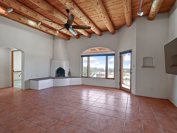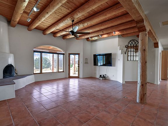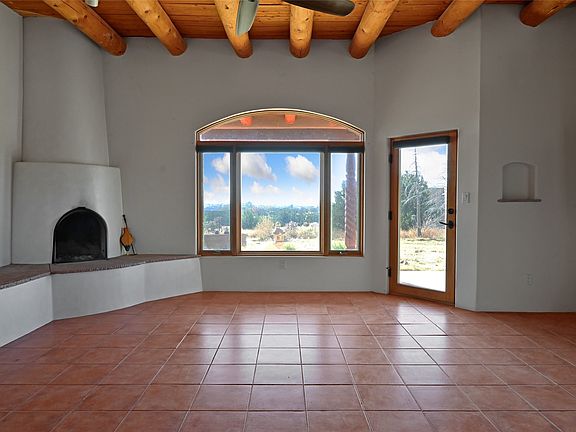 Desirable Eldorado location with stunning Sangre de Cristo and Sandia Mountain views! Set on almost two acres, this beautiful home offers the perfect balance of rural serenity and easy access to Santa Fe’s shops, dining, and amenities. Featuring viga ceilings, a very large open floor plan, and generously sized rooms throughout, the home combines spaciousness with classic Santa Fe charm. The flexible layout includes three ensuite bedrooms, four bathrooms, plus an office, ideal for guests, family, or a home workspace. Numerous recent upgrades include the kitchen, bathrooms, well equipment, and roof, providing modern comfort and peace of mind. The modern eat-in kitchen opens to bright living areas accented by wood vigas and a kiva fireplace. Enjoy in-floor radiant heat and take in the expansive mountain views from the covered portal, perfect for outdoor dining or quiet evenings. A two-car garage and workshop/artist studio offer ample space for projects and storage. With breathtaking views, thoughtful upgrades, and an unbeatable Eldorado setting, this home truly has it all—space, style, and comfort in every detail.