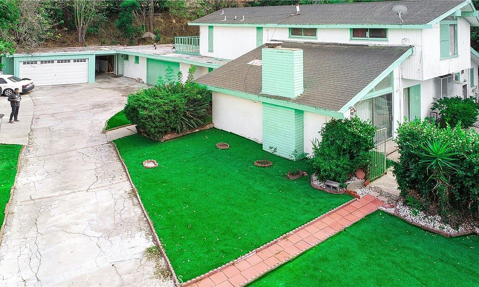 **PRICE IMPROVEMENT**As you step inside the front door, you'll be greeted by an inviting living space that seamlessly combines comfort and functionality. This floor plan of the living and dining area provides for an entertaining guests or enjoying quality time with loved ones. Open concept living room with family and kitchen in the middle on ground level with a downstairs bedroom and full bathroom. Second floor features a two bedrooms with en suite baths and a master bedroom with en suite and outdoor patio. Beautiful tranquil lush green back yard with sparkling swimming pool. Two car attached garage. There's also a guest house with a living room, bedroom, bathroom and kitchen self contained. There's also a second detached two car garage with a flat roof. Front driveway easily parks over twenty vehicles. Very large lot of over 20,000 square feet.