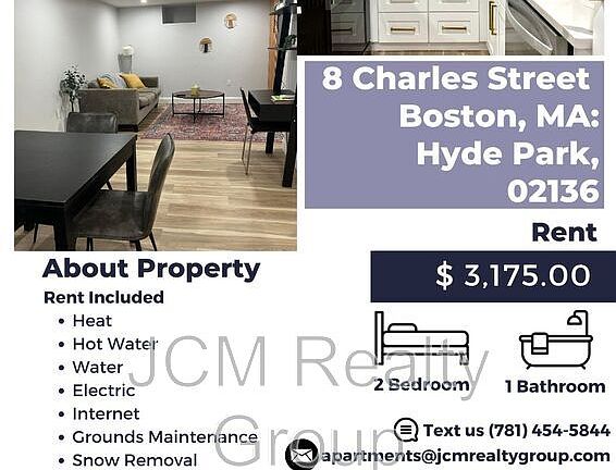 8 Charles st, Hyde park Available June 1 Bedrooms: 2 Bathrooms: 1 Rental Terms: First Month: $3,175.00 No Last Month Deposit: $3,175.00 Broker Fee: $3,175.00 Utilities Included: Heat Hot Water Water Electric Internet Grounds Maintenance Snow Removal Amenities: Refrigerator Range Dishwasher Microwave Heating Gas Off Street Parking Laundry In Unit Cats/Dogs allowed Deleaded Don't miss this opportunity schedule your showing today!