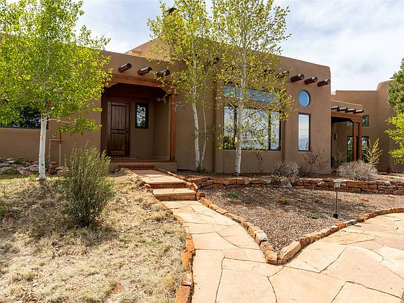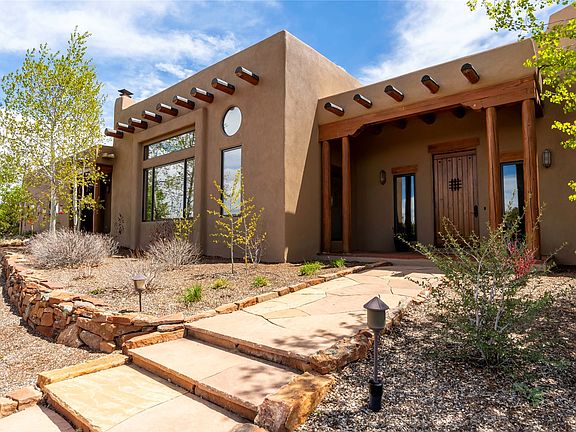 Located in the rolling hills of Las Campanas Parkside, 8 Clematis Circle sits on a small rise, taking in the sweeping Sandia, Ortiz and Jemez Mountain views through ample, large windows. This Pueblo styled home has been recently refreshed with soft contemporary touches. The floor plan flows from the entrance foyer to living room, to an intimate dining area and large, well-appointed kitchen with breakfast banco. Down a few steps is a family room large enough for comfortable TV watching, and a cozy reading area by the kiva fireplace. Tying the home together, is a bricked, central patio, accessed from the kitchen, allowing for outdoor entertaining in the warmer months. The primary suite faces south and includes a portal, a generous bathroom and extensive, walk-in closet. There is good separation of space between the primary bedroom and guest bedrooms, each with their own ensuite bathrooms. The grounds have been tastefully xeriscaped, in keeping with the high desert climate. In the past two years, the property has undergone many updates, including warm plaster walls in the main living areas and primary bedroom, grey porcelain floor tile, updated lighting, ductless mini split units, a new TPO membrane roof, a 10.36kW PV solar system and new stucco. This truly spectacular home is located a few minutes’ drive to Santa Fe for fine dining, shopping and galleries. For more active souls, skiing, hiking, horseback riding or golf opportunities are all nearby.