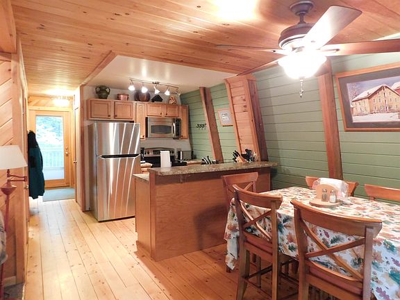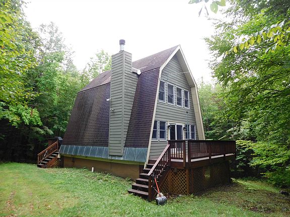 This 4 bedroom 1 1/2 bath gambrel chalet is waiting for you to move right in. House features a remodeled kitchen with breakfast bar and stainless steel appliances, remodeled baths, wood flooring in dining and kitchen, cathedral ceiling, wood burning fireplace, loft space (11x16) in one bedroom, and an unfinished full basement. Relax and enjoy the peace and quiet from either the front or back deck. Private setting on 1.03 acres in Dover Hills. Snowmobile access to the VAST trail is just up the road. Close to Mount Snow and Hermitage Club, area restaurants.