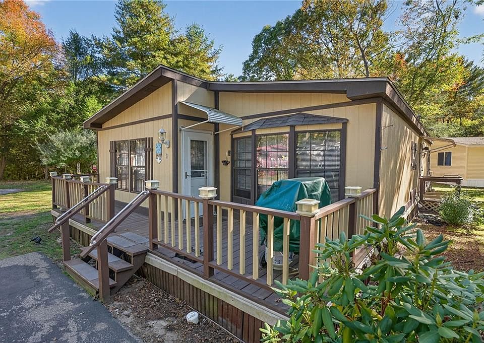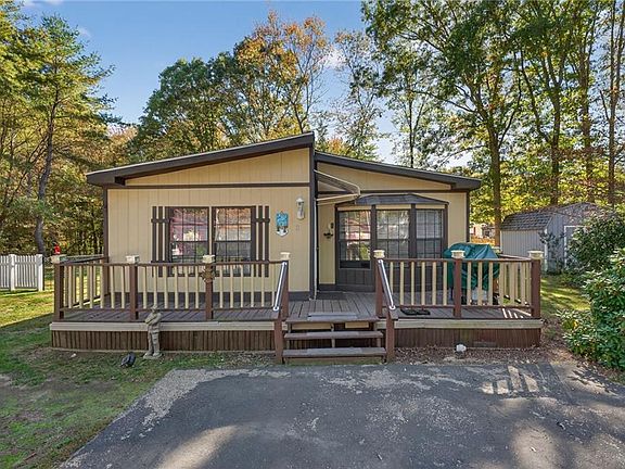 This double wide mobile home is located in Leisure Village, on an end lot, abutting a wooded area, in a 55+ community. You can sit on your deck with your morning coffee or maybe in your partially fenced yard and watch the wildlife thrive! Maybe let your furry pets run around in a recently installed 30 x 50 fenced area. There is also a large shed and several storage units for all of your seasonal items! This is one of the best lots in the park, private and treed! What you will see when entering this home is an open floor plan with an eat-in kitchen, dining room, and spacious living room with a cathedral ceiling. You will find the Primary Bedroom with plenty of storage and an ensuite ready for you to be complete with your custom finishes! Make it your own!! In addition, this home offers another bathroom with a walk in shower, an additional bedroom and a separate laundry room. There are new screens throughout, new front doors, hot water tank is about 2 years new, new panel and flue on the furnace. The best update completed so far, for heating/cooling efficiency, was the spray foam insulation in the floors, which was completed by RISE! There have been approximately $25M in upgrades over the past 2 years, great news for the new owners! Mobile Home is located on Leased Land. Subject to mobile park approval.