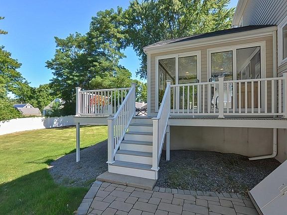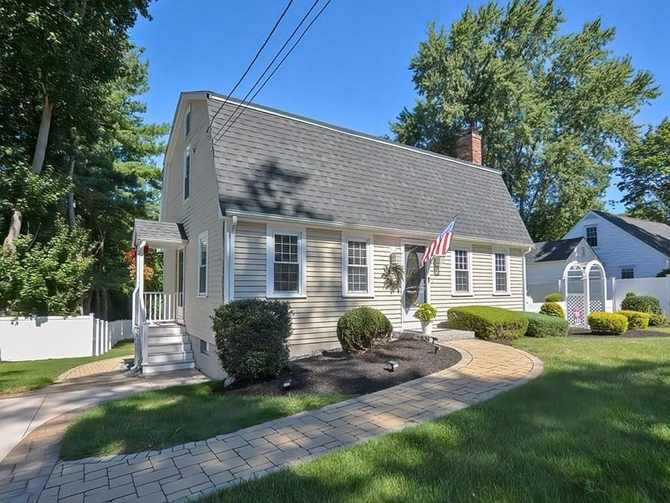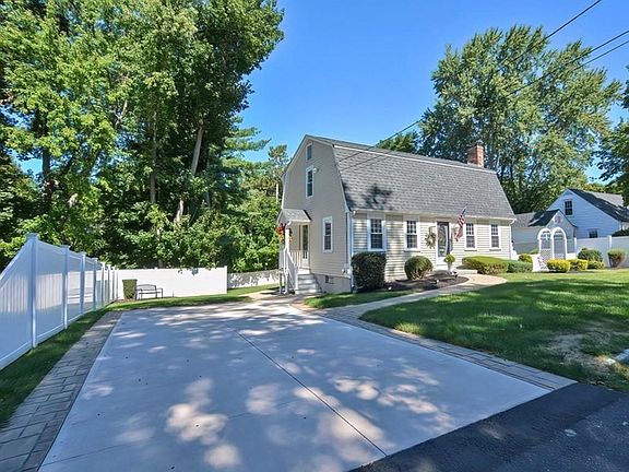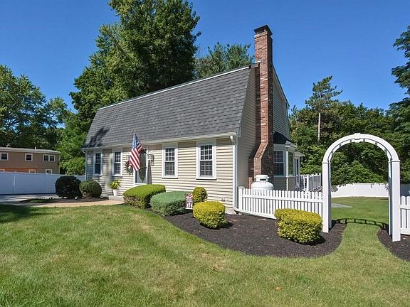 This picture-perfect gambrel Cape has been lovingly maintained throughout its multi-generational ownership. The professionally landscaped yard has a 6' vinyl privacy fence w/Arbour, lush plantings, carpet-like lawn w/irrigation & new concrete driveway w/stamped concrete border. Side covered porch leads to kitchen entryway. Half bath was & can easily be converted back to full bath. Tub was removed to bring laundry up from basement. Kitchen was remodeled w/custom light red birch cabinets w/pantry, oversized island w/seating for 10 & storage, desk, instant hot water & walkout bay window. Slider to gorgeous sunroom w/3 walls of sliders leading to wrap-around composite deck. Living rm has new propane gas fireplace w/blower fan used as heating source throughout the colder seasons. Formal dining rm w/wainscoting. Several options for 3rd bedroom. 2nd floor has 2 front-to-back bedrooms w/double closets & closet systems. Recently updated: Buderus furnace, roof, concrete driveway, vinyl fence.