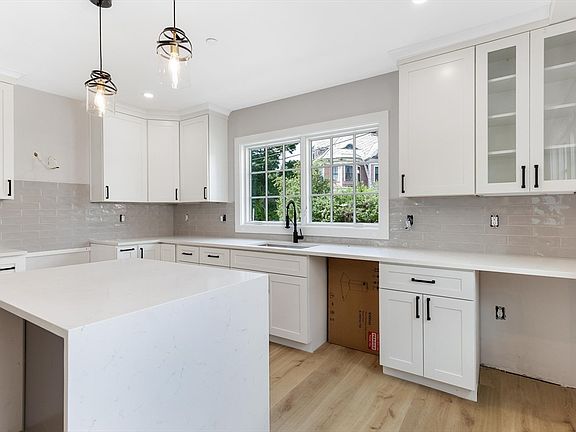 Modern bathTray ceilingQuartz countertopsRecessed lightingStainless steel appliancesStylish tile backsplashAbundant cabinetry