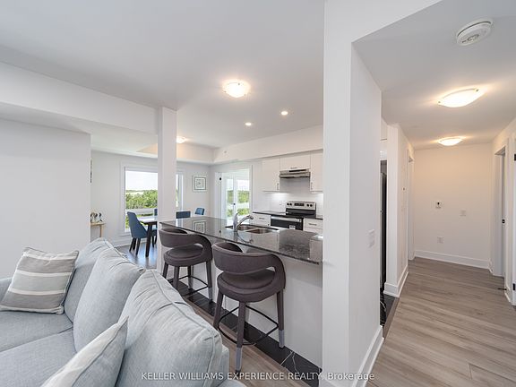 This stunning 3-bedroom, 2-bathroom corner unit offers 1,265 sq. ft. of modern living, with wraparound corner windows and a balcony facing southeast perfect for enjoying breathtaking sunrises every morning. Featuring $33,000 in upgrades, the home showcases an upgraded kitchen with stainless-steel appliances, under-cabinet lighting, pot lights, granite countertops, and a stylish tile backsplash. Porcelain tile flooring flows through the foyer, kitchen, and bathrooms, while the spacious living room opens to a balcony equipped with a gas barbeque hookup and overlooks lush green space. The primary suite boasts a walk-in closet and a private ensuite, complemented by custom blinds throughout. Accessible features, including wider door frames and hallways as well as accessible light switches, add both comfort and convenience. Ideally located just minutes from the South Barrie GO Station, restaurants, shopping, and more, this nearly new condo is still covered under Tarion Warranty