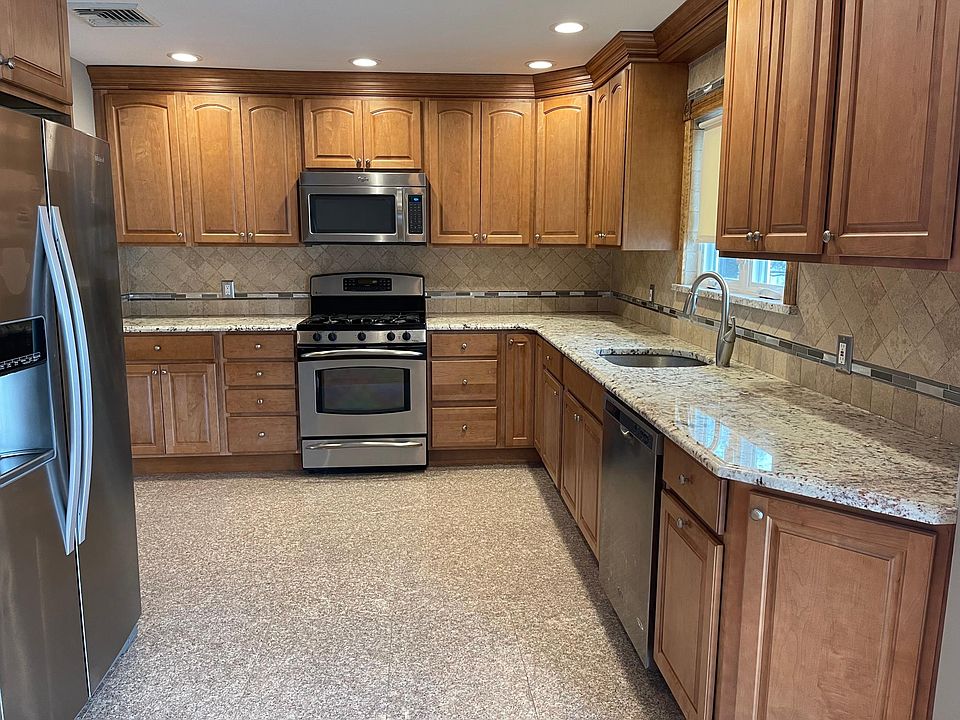 Beautiful large split level home. Walk into the Entry Hall to marble floors. Large living room and dining room with a slider to a beautiful deck. Large kitchen with stainless steel appliances. Gas cooking and gas heating. Central A/C Primary bedroom with a full bathroom and two additional large bedrooms and full bathroom. All bedrooms have ceiling fans. Den with tile flooring updated bath and sliding doors to a patio. Fully finished basement with tile floors, washer and dryer and additional storage. Garage with door opener and entrance into den. Inground sprinkler system. Fully fenced yard. Owner pays for landscaping and water. Tenant pays for gas, electric, cable and wifi. Tenant does own snow removal. ONE MONTH SECURITY FEE AND ONE MONTH BROKER FEE. NO SMOKING. No pets