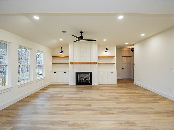 living room, fireplace framed by built in's and floating shelves. Open concept and kitchen that is perfect for