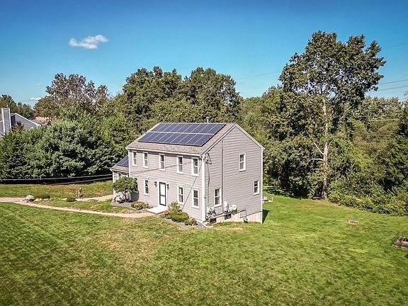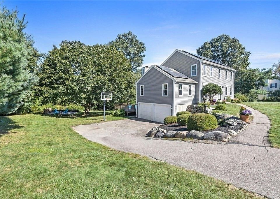 Lovingly-maintained Colonial-style home with a 2-car garage & 3 generous-sized bedrooms. Your smart floor plan offers a fully applianced kitchen, dining room, den & cozy living room with wood-burning fireplace & hardwood floors. Convenient first-floor laundry & half bath. Come outside to the serene backyard, enveloped by nature, with upper & lower decks perfect for entertaining. Summers are enjoyed by your above-ground pool & fire pit area. Nestled in a mature neighborhood on a cul-de-sac street, you'll have all the tranquility you desire while still being close to shopping, restaurants, & minutes to Bridgewater State University. Partially-finished basement is waiting for finishing touches. New AC unit 2023 | Water heater 2019 | Roof 2018 | Siding 2013 | Replacement windows 2021 | New front door & storm door | Huge electric savings with leased solar panels with transferrable contract | Gas heating & town water. Come discover your perfect turn-key home!