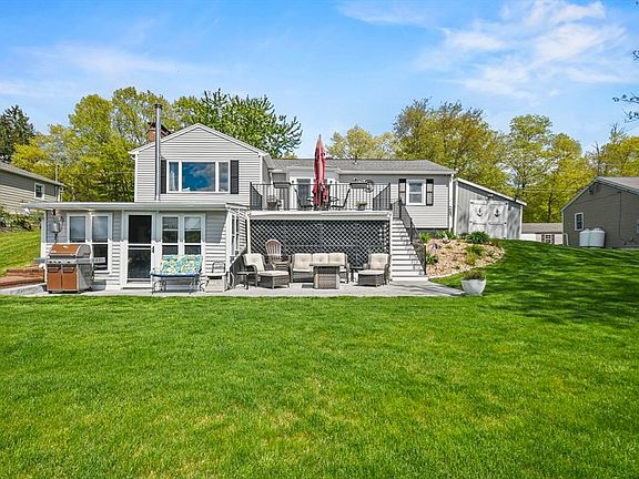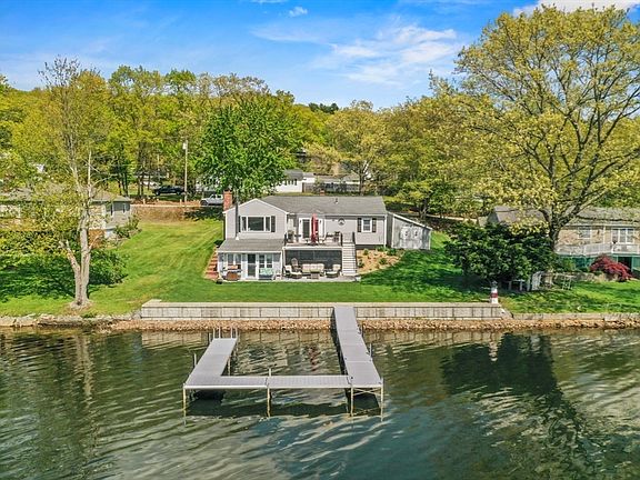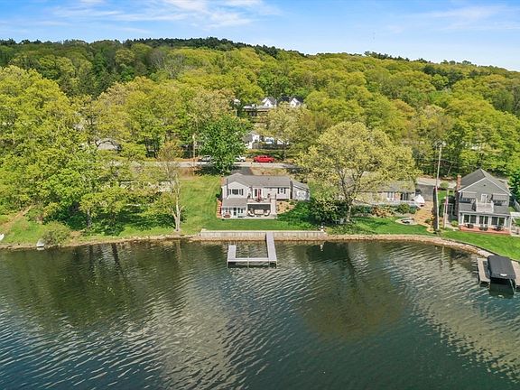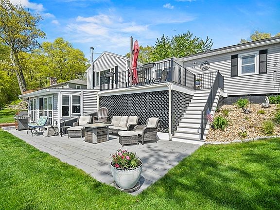 Nestled along the picturesque shores of Webster Lake, this waterfront Ranch epitomizes the idyllic charm of lakeside living, w/ views of the lake from nearly every room. Discover a welcoming living rm w/ cathedral ceilings, a cozy fireplace, and a large picture window framing breathtaking views of the lake. The dining rm offers HW flrs & a French door that beckons you to the expansive deck overlooking the water, perfect for dining or entertaining against a backdrop of sunsets. The kitchen boasts granite counters, ample cabinet space, & a breakfast bar. Finished walkout lower level has a full bath and is the perfect space to unwind after a fun day on the lake. Outside, a private dock awaits, offering direct access to the waters of the lake for boating, fishing, & more! Enjoy leisurely afternoons on the patio, soaking up the sun. Whether you're relaxing by the fire, hosting guests on the deck, or enjoying water sports, this waterfront retreat offers year-round enjoyment!