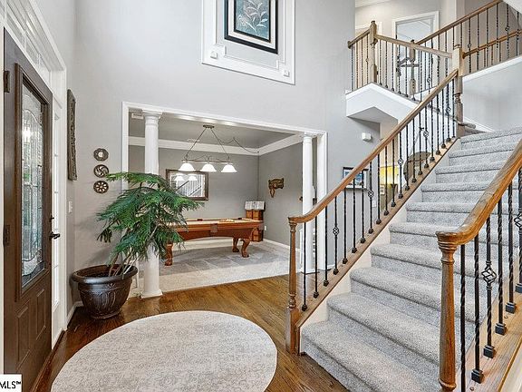 Location is everything, and this beautiful home delivers. Nestled on a quiet cul-de-sac and backed by mature trees, this property offers the perfect blend of privacy and convenience. With four bedrooms and two and a half baths, the thoughtfully designed floor plan provides versatile living spaces to suit any family. As you approach, you’re welcomed by a charming rocking chair front porch featuring an upgraded wood-planked ceiling and a durable, sun-resistant front door. Step inside to a two-story foyer and be greeted by freshly refinished hardwood floors and a grand entrance that sets the tone for the rest of the home. Just off the foyer is a formal dining room, ideal for hosting holiday meals or family gatherings. Across the hall, a flex space awaits—perfect for a home library, game room, or reading nook. The great room is filled with natural light thanks to oversized windows and features a cozy gas log fireplace for those cool evenings. Adjacent to the great room, the sunroom offers a peaceful retreat for enjoying your morning coffee with serene views of the treed backyard. The chef’s kitchen is the heart of the home, boasting ample cabinetry, a custom extended island, gas range, wall oven, built-in microwave, and a massive walk-in pantry. Down the hall, you’ll find a private home office with custom built-ins, ideal for remote work. The home offers dual staircases for easy access to the second level. Upstairs, the spacious primary suite includes his and hers closets, dual vanities, a custom walk-in shower, and a soaking tub perfect for unwinding. Three additional bedrooms all feature generous closet space. A shared full bath with an upgraded walk-in shower separates two of the secondary bedrooms. Step outside through French doors to a large screened-in patio, ideal for enjoying the Carolina evenings. An extended deck provides the perfect space for grilling and entertaining, while a firepit area adds a touch of charm and coziness. Additional highlights include a stylish kitchen backsplash, a full-yard irrigation system, professionally landscaped grounds with extra pavers, a walk-in laundry room with built-in cabinetry and a sink, an epoxy-coated garage floor, new roof, new carpet and a private, mature lot that enhances the home’s peaceful setting. This home has it all—comfort, function, and a prime location. Schedule your showing today!