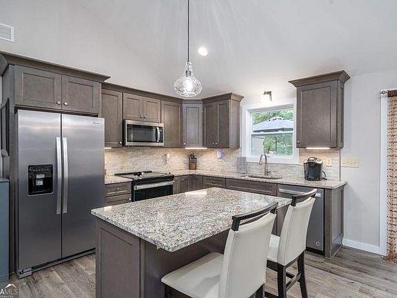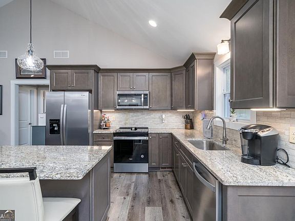 Cozy gas log fireplaceCentral islandOpen back deckCovered front porchHorseshoe drivewayStainless steel appliancesCute accent barn doors