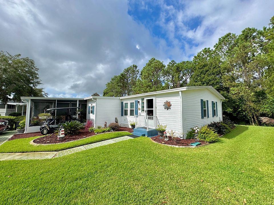 Welcome to this charming 2-bedroom, 2-bath 1997 Jacobsen home located in the highly desirable Aberdeen at Ormond Beach community. Nestled among mature trees, this home offers a peaceful backyard setting with a private patio perfect for relaxing or entertaining. The front features an extended 10' screened lanai with large screen doors wide enough to fit a motorcycle, providing both function and flexibility. Inside, you'll find a warm, cabin-style feel accented with beautiful stained wood trim throughout. Enjoy convenient parking with a two-car driveway plus golf cart space - perfect for exploring all that Aberdeen has to offer! Community Highlights: Residents enjoy access to a clubhouse with pool, indoor hot tub, shuffleboard, bocce, horseshoes, tennis and pickleball courts, library, billiard room, fitness center, card room, and several sitting areas throughout the grounds. Scenic ponds and walking paths create a tranquil setting, and the community is gated with 24-hour security for peace of mind. Discover the best of active 55+ Florida living in this welcoming and well-maintained community - where comfort, recreation, and relaxation meet!