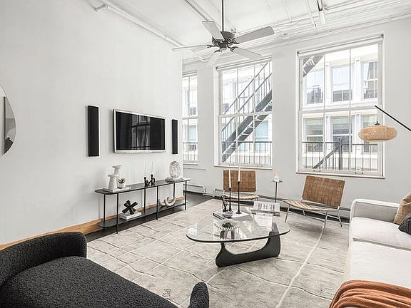 This gorgeous, sprawling 20 ft wide 12 foot-ceiling loft with approximately 1,403 SF of living space is located on a cobblestoned street in the heart of SoHo. As you enter this floor-through unit, you will see an open kitchen and a massive 20 FT wide and 12-foot ceiling living room that is ideal for entertaining with generously sized Eastern facing windows. Exposed brick walls and oversized windows highlight the soaring 12-foot ceilings.