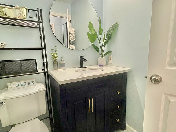 Modern bathRecessed lightingOversized center islandShaker cabinetryVented range hoodLuxury-vinyl plank flooringSleek eat-in kitchen