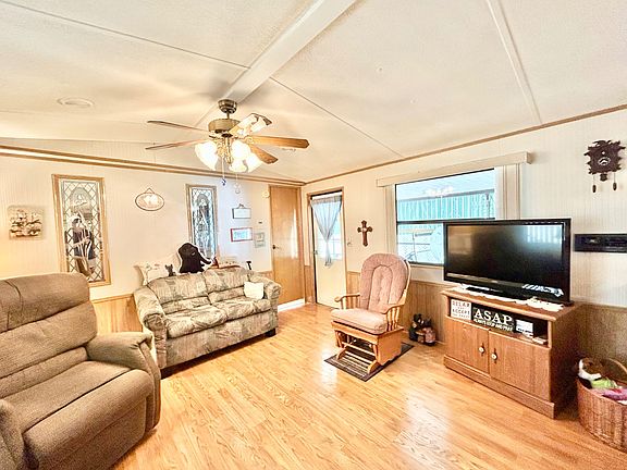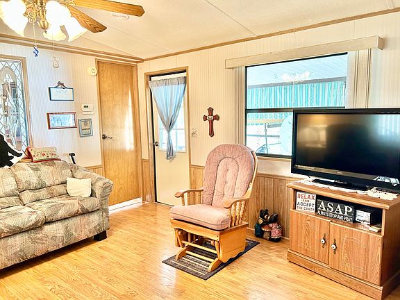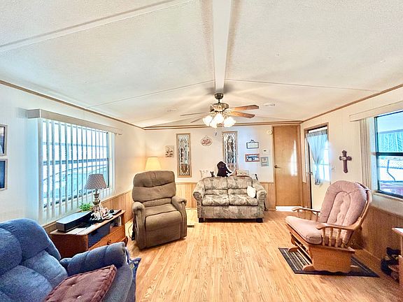 This charming 2 bedroom, 2 bath fully furnished home offers stunning lake views and a comfortable, move-in ready lifestyle. The master suite features an ensuite bath for added privacy, while the open kitchen boasts beautiful wood cabinets and plenty of storage space. A spacious family room is perfect for entertaining, and the home includes two carports plus a large under-roof storage unit for all your needs. Additional features include hurricane shutters, awnings, and a sunshade for comfort and peace of mind.Take advantage of: Sparkling outdoor swimming pool for refreshing relaxation. Catch-and-release fishing for outdoor enjoyment. Clubhouse for social events and gatherings. Playground for the young and young-at-heart. Pet park for your furry companions. Cozy outdoor fire pit for evening relaxation. Walking and hiking trails through beautifully landscaped grounds. Pickleball, Cornhole, Shuffleboard, Bocce Ball, and Petanque courts for friendly competition. Library for quiet reading. Ample storage areas and self-service RV wash for convenience. Modern laundry facility with restrooms and hot showers. Free Wi-Fi throughout the community. Mailroom for easy access to your mail. On-site management for peace of mind. Plus, Sunshine RV Resort is conveniently located close to shopping and entertainment, so you can enjoy all the conveniences of life while still being surrounded by nature and tranquility. This is the perfect place to enjoy your retirement in comfort and style. **Golf cart is negotiable. Don't miss out on the opportunity to make this charming home yours. Schedule a tour today!