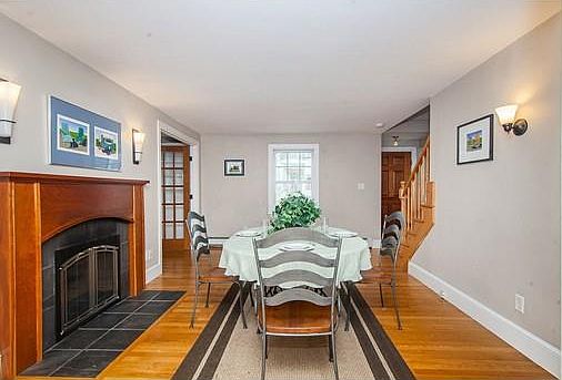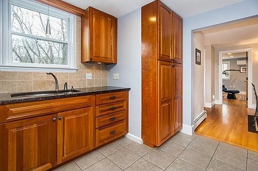 The Horn Pond Brook runs behind this renovated home making for a tranquil retreat. Once a cape it has been expanded with a new wing creating a modern open living room that leads out to the deck. Upstairs are three bedrooms with a master bedroom suite with vaulted ceilings. Crafted with loving detail, the home has hand milled cherry mantels, solid cherry stained doors, updated 200 amp electrical, young roof, replaced windows, gas heating system and most recently central air. The granite kitchen can be expanded into the breakfast nook and the dining room features a gas fireplace. The deck overlooks the fenced-in yard with sprinkler system, a paver-stone patio with under-lighting and arbor. The garden features a peach tree and flowering crab-apple and a composted Victory Garden plot. The paved driveway has room for 3 cars and one in the garage.