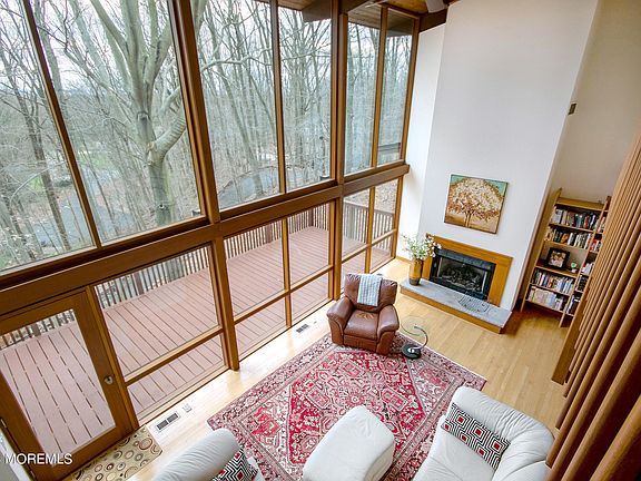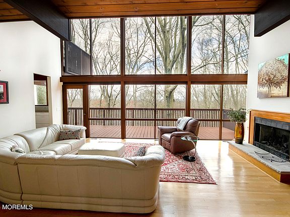 PRICE ADJUSTMENT! Truly a Rare Find! Private One -Of- A Kind Peaceful Sanctuary! Nestled atop a picturesque hill, you'll discover this unique home. This Custom Built home is situated on 1.4 acres in the Hills of Holmdel. The home offers spacious rooms, soaring cedar-lined ceilings and walls of windows which bring the outside in and offers stunning Winter and Sunset views! Living Room with gas-burning fireplace and wall of windows. Eat-in Kitchen with newer appliances features a beautiful breakfast area and plenty of granite countertop space. The 1st floor additionally offers 2 bedrooms, Dining Room, and laundry room. Multi levels of decking surround the home overlooking the natural landscape. 3 levels of living space offers room for everyone. Partially finished basement with high ceilings, bedroom, full bathroom, separate access, and plenty of storage and Golf Cave Room. Possible Mother/Daughter. A two-car attached garage and a two-car oversized detached garage with endless options. Close to all and Highly Rated Holmdel Schools, Parks, Transportation, and Shopping.