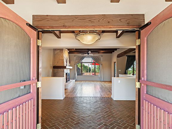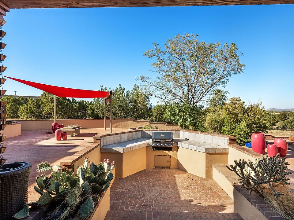 ENTERTAINER'S PARADISE! Not to mention the spectacular postcard-worthy sunset views of the Sandia and Ortiz, mountains from the back patio, and Sangres from the front patio. Sited on a large greenbelt at the end of a cul-de-sac. Four mini-splits provide real air conditioning. New stucco, interior paint and brick floors refinished in September 2023. Kitchen updated in 2022 with new appliances - a 6-burner Wolf gas range, Bosch dishwasher and LG refrigerator and more counter seating and storage. Two primary suites on opposite ends of the house, both with large walk-in closets, provide numerous options, from an in-law suite, to a large artist's studio. The larger of the suites has a sitting room with fantastic mountain views, a smaller room that is plumbed to be a kitchenette, and a separate back entrance. Huge closest with an entire wall of built-in shelves and drawers in first primary bedroom with beautiful spa-like bath with jetted tub, and double sinks. Banco with storage under picture window. Primary bedroom two has a generous 2-person jetted tub, double sinks and beautiful shower. Both primary suites have a fireplace, and there are two more in living areas, for a total of four. Fifth bedroom is set up as a beautiful office with built-ins. The new brick back patio has a sunken seating area with a built-in gas grill, a fire table and a long covered portal which is a great place to entertain or relax. The two added front flagstone patios provide additional space for seating and gorgeous views of snow-covered mountains in the winter - both patios have solar lighting. There is also a secure coyote-fenced backyard space that provides a safe area for dogs to play. Generous laundry room with sink and pantry. Oversized, extra deep 2-car garage with storage. A few steps up from the garage, otherwise single-level. Radiant is PEX. Domestic is copper. Water softener 2019. Each room has a ceiling fan. Custom screen doors, insulated blinds.